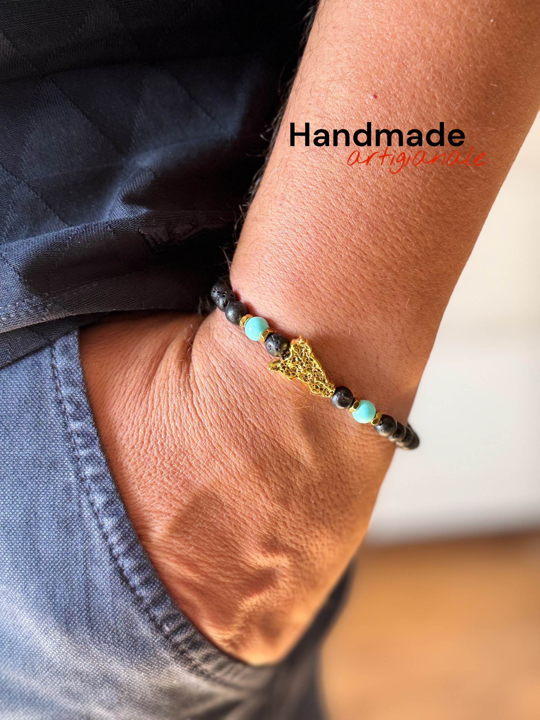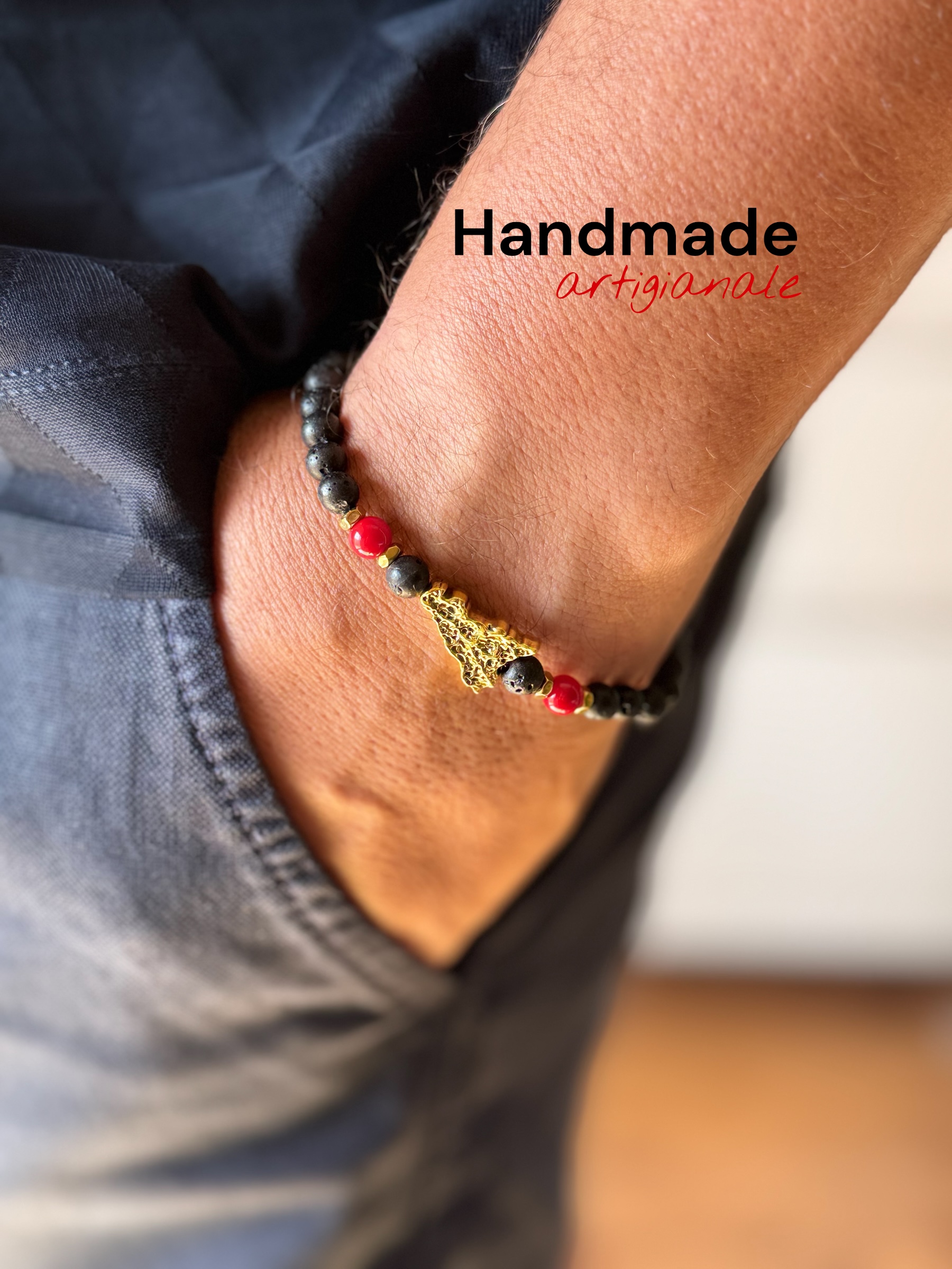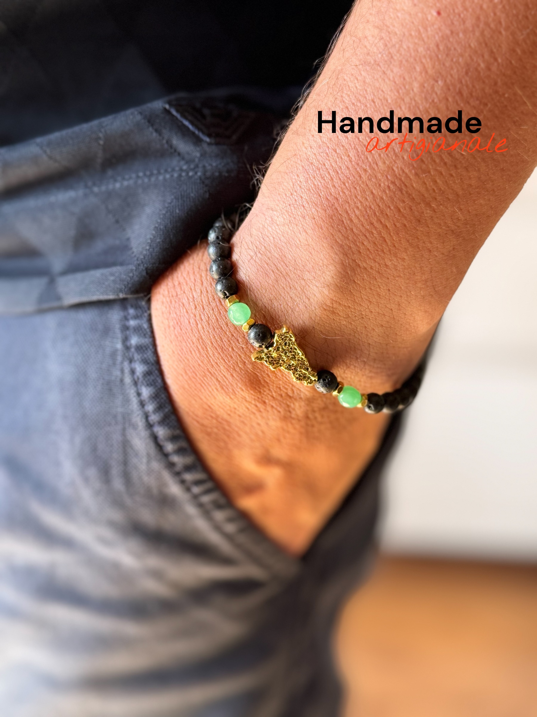 Bracciale elastico uomo cm 21 in pietra lavica e Sicilia in alluminio color oro.